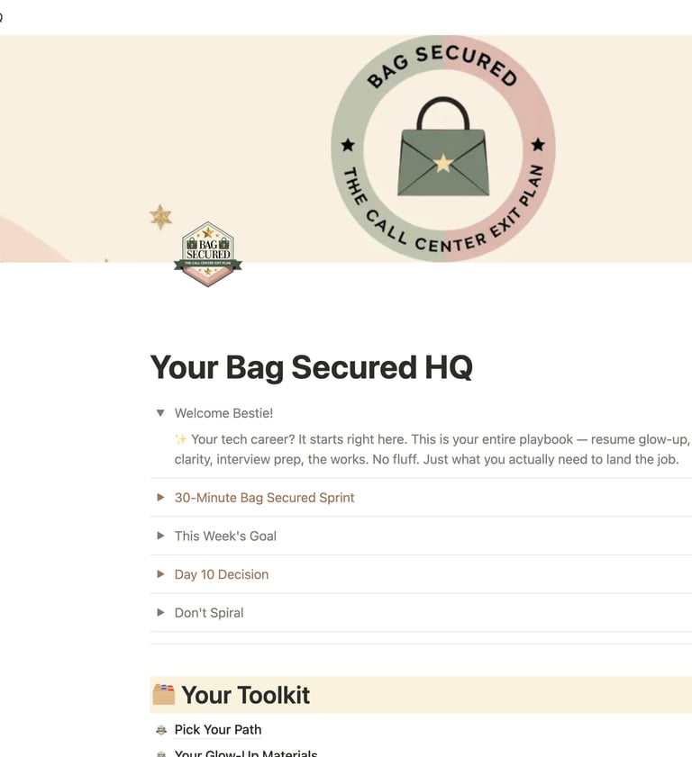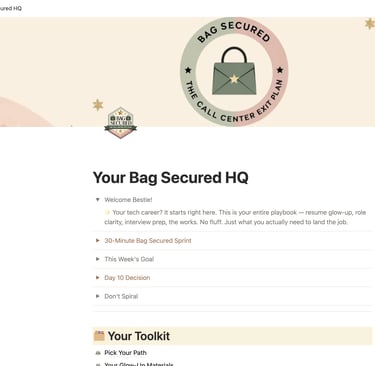 You already have the skills. Bag Secured helps you translate your experience into tech-ready language, get clear on what roles to target (CS, SDR/BDR), and walk into interviews with a story that makes sense. A plug-and-play Notion system that turns your customer service experience into tech-ready resume bullets, role clarity, and interview answers — without starting from scratch.